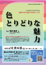 (講演概要)色彩は私たちの暮らしの中にあふれ、あまりに身近で当たり前の存在であるがゆえに、その奥深さに気づく機会は意外と少ないかもしれません。人の心理や行動に強い影響を与えることは広く認知されているにも関わらず、科学的には未解明な領域も多く残されています。近年、社会の中で色彩の力が改めて注目され始めており、その魅力をどのように理解し活用するかが問われています。本講演では、私自身が取り組んでいる工学から人文学に至る最新の研究成果も織り交ぜながら、AI時代における色彩学の新しい可能性まで展望します。さらに、色彩の初学者から専門家まで楽しんでいただけるよう、日常生活との関わりや番組出演の裏話も交えながら、色とりどりの魅力をお伝えします。色彩の力とおもしろさを一緒に再考しましょう。